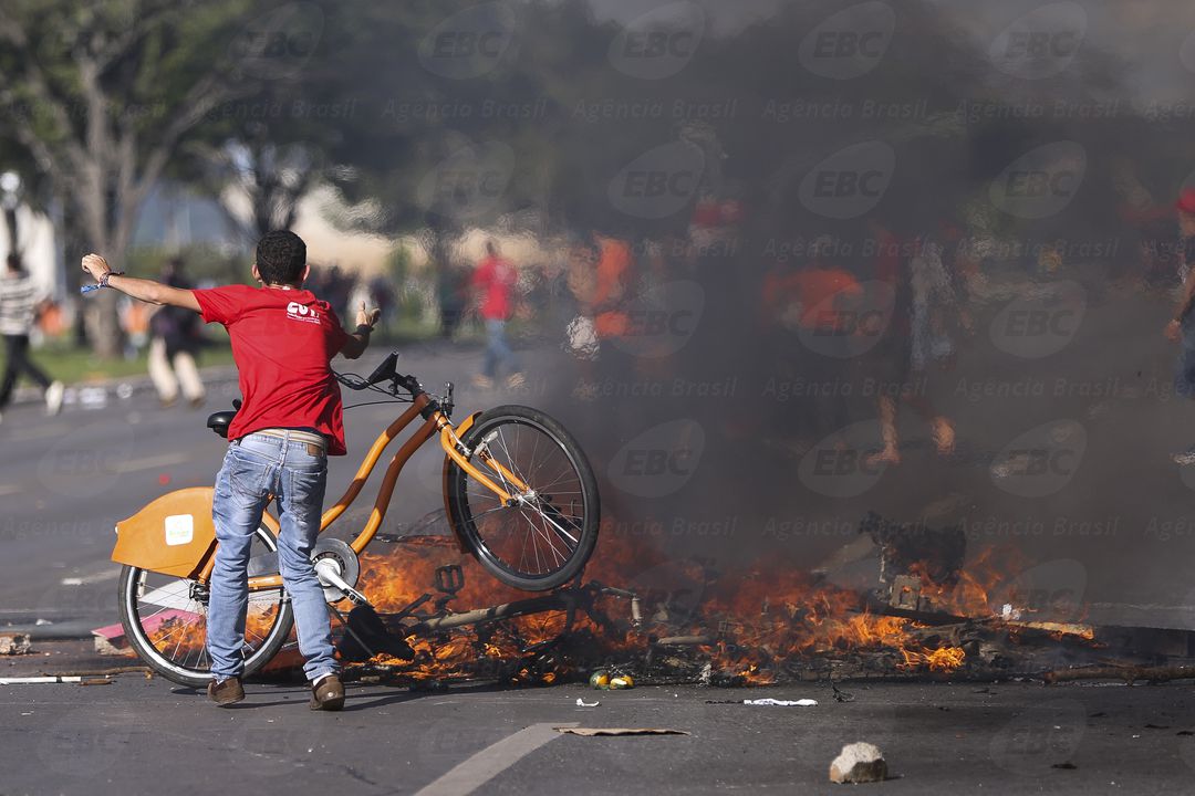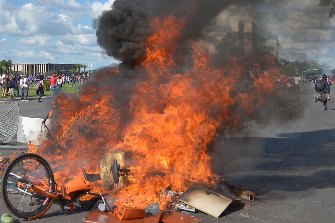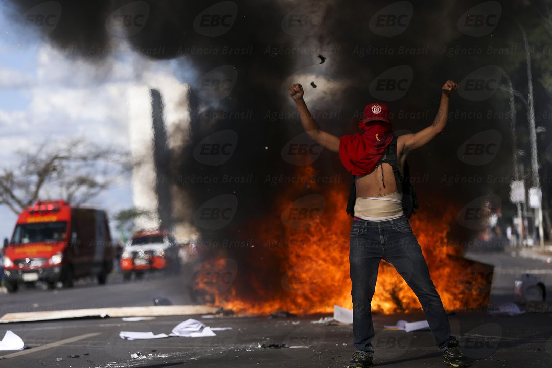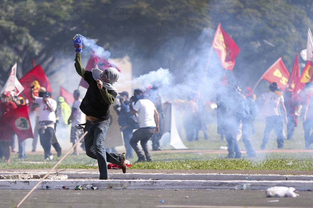 O Planalto destaca ainda o tumulto ocorrido durante a manifestação de hoje que protestava contra as reformas debatidas no Congresso Nacional e pedia a saída de Michel Temer. No protesto, um grupo de manifestantes e policiais entrou em confronto. O grupo quebrou vidraças dos prédios dos ministérios e colocou fogo em banheiros químicos. A polícia reagiu com bombas de efeito moral, gás lacrimogêneo e balas de borracha. Os fatos, segundo o governo, motivaram o emprego de militares na proteção do patrimônio público.